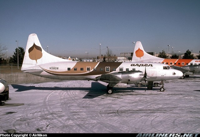 Aspen Airways Convair 580, N5808, is shown at Denver Stapleton International Airport in March 1985.