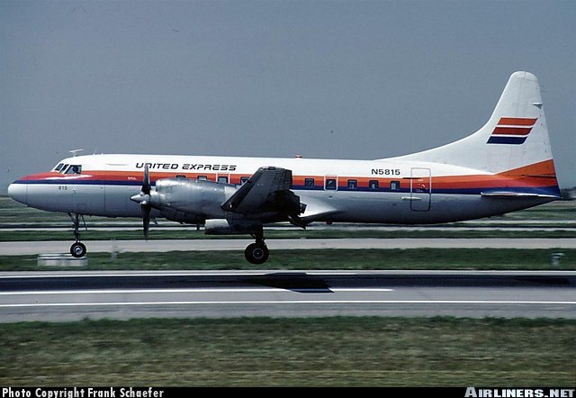 United Express Convair 580, N5815, is shown arriving at Denver Stapleton International Airport in July 1988.
