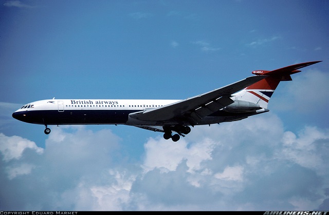 British Airways Vickers Super VC10, G-ASGJ, is shown arriving at London Heathrow in August 1979.