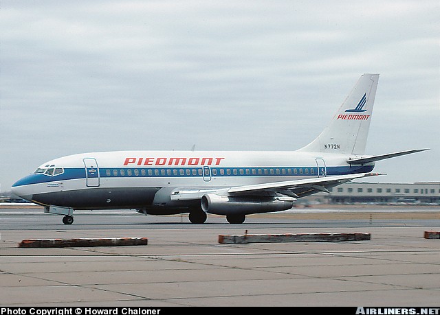 Piedmont Airlines Boeing 737-201, N772N, "Peninsula Pacemaker," is shown at Kennedy International Airport